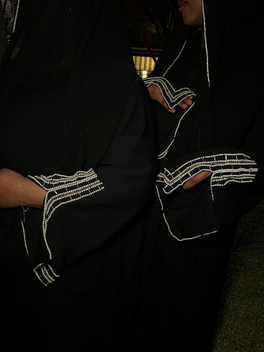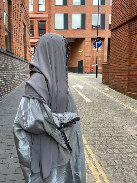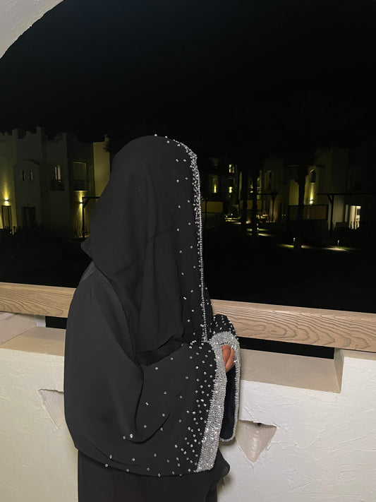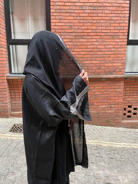 Elevate your wardrobe with this beautiful handmade abaya and hijab, made with premium materials. Each gem has been stitched on by hand to create the perfect abaya for you.