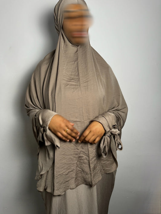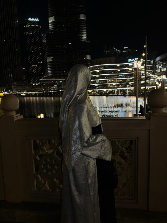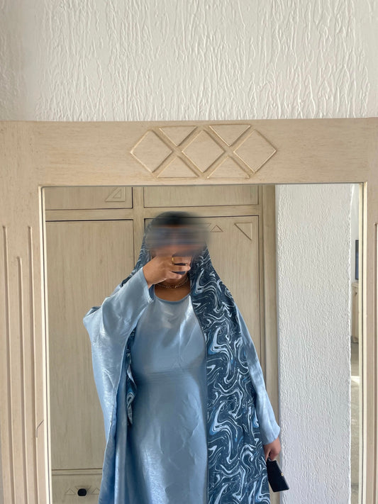 This four piece abaya is perfect to wear as an everyday abaya or to dress up for a special occasion. The inner abaya and the outer abaya can be worn separately which adds to the versaility of the set.